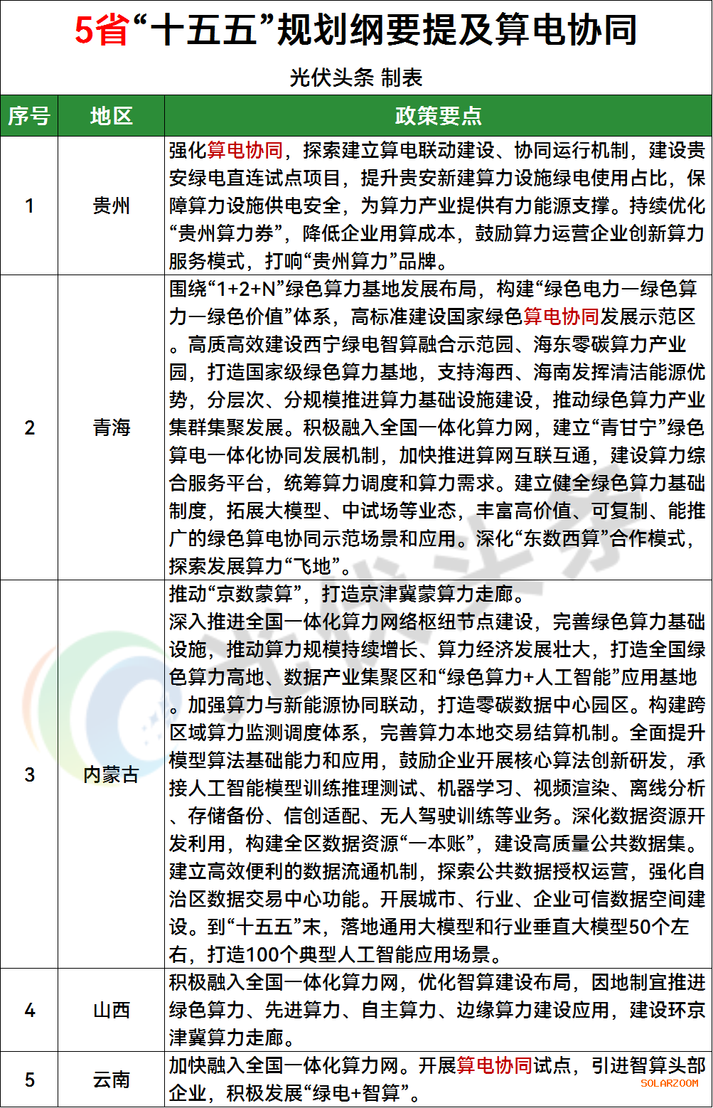 5省/市提及算电协同:贵州、青海、内蒙古、山西、云南