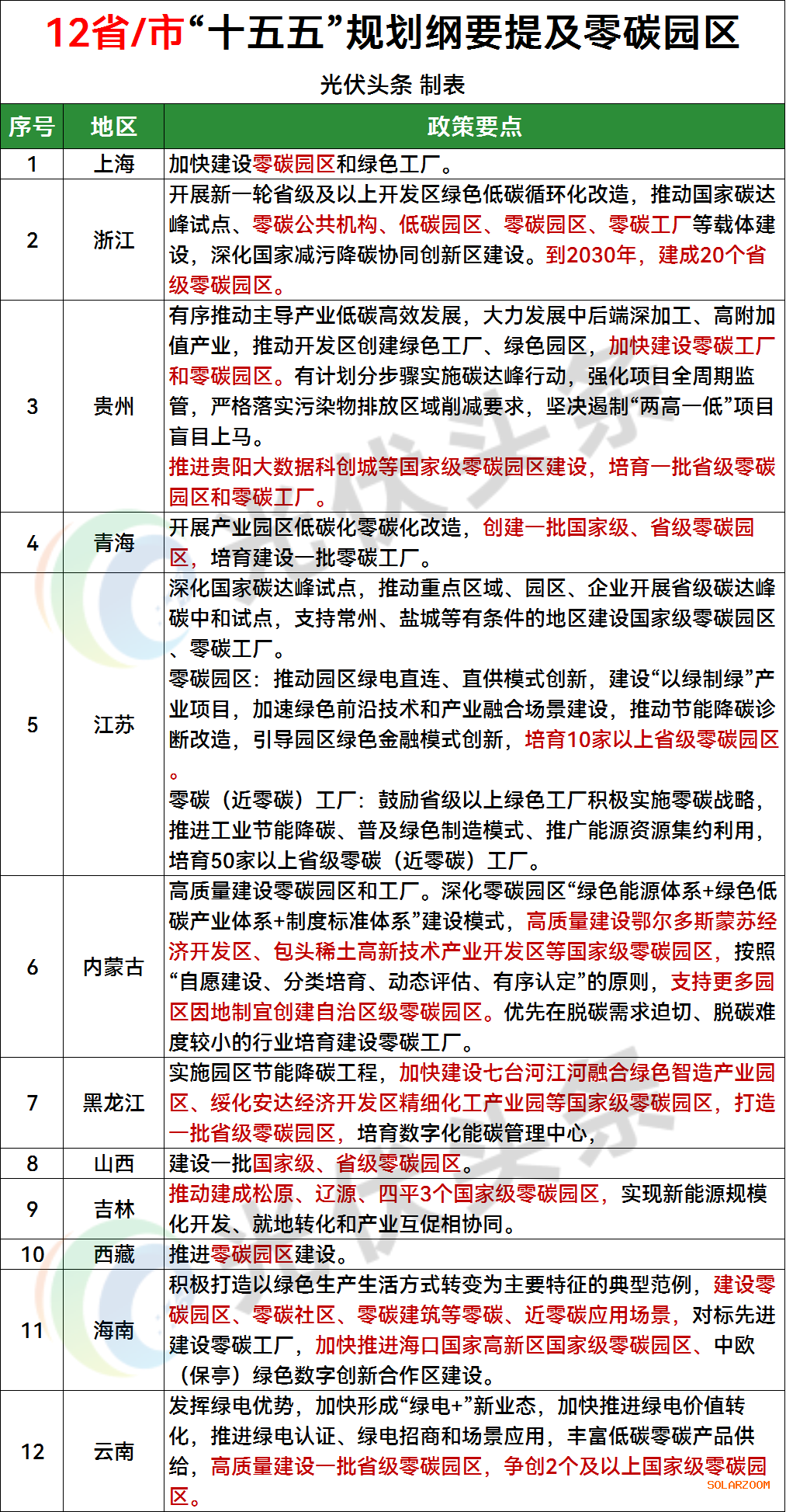12省/市提及零碳园区:上海、浙江、贵州、青海、江苏、内蒙古、黑龙江、山西、吉林、西藏、海南、云南;