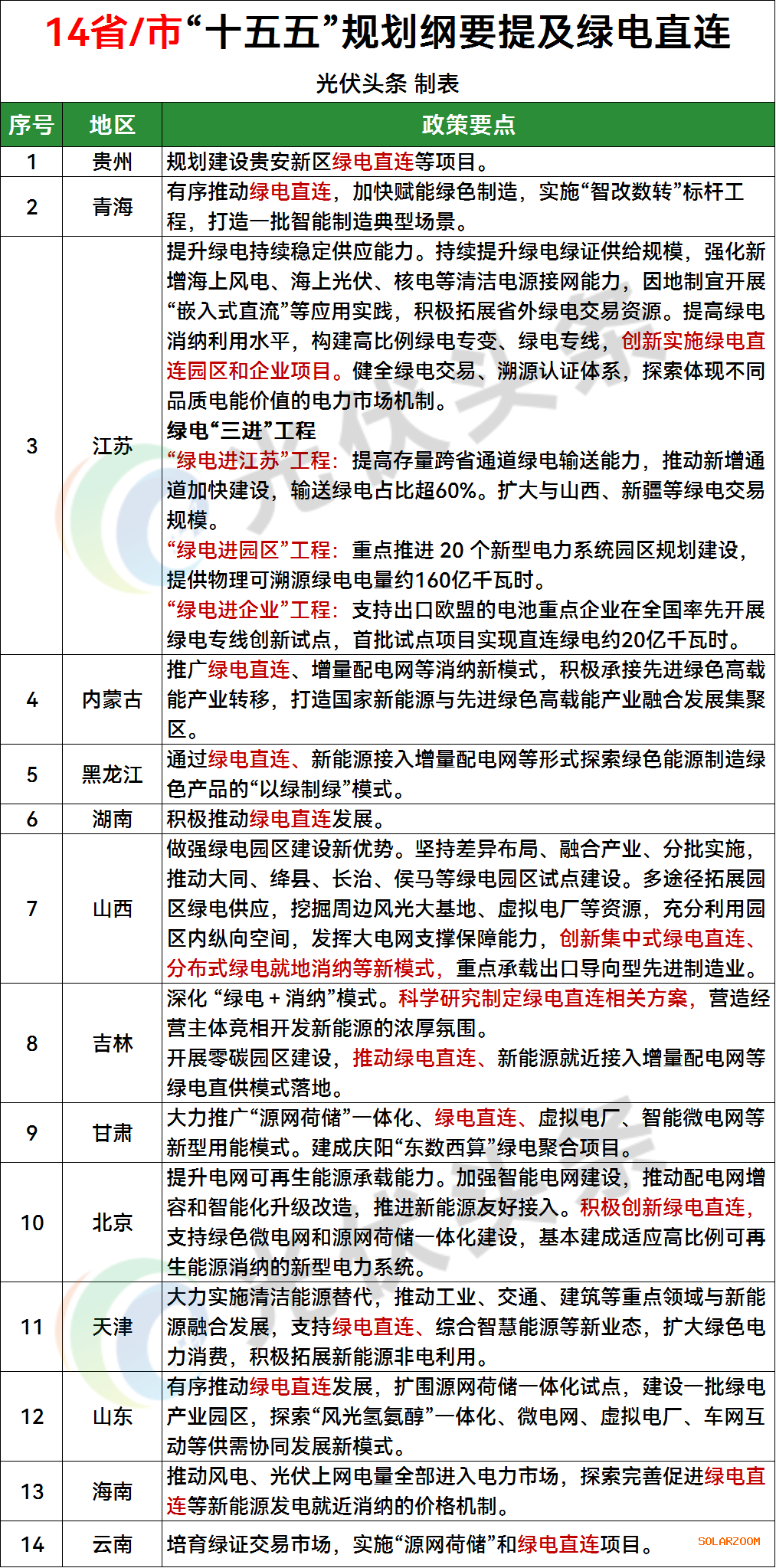14省/市提及绿电直连:贵州、青海、江苏、内蒙古、黑龙江、湖南、山西、吉林、甘肃、北京、天津、山东、海南、云南;