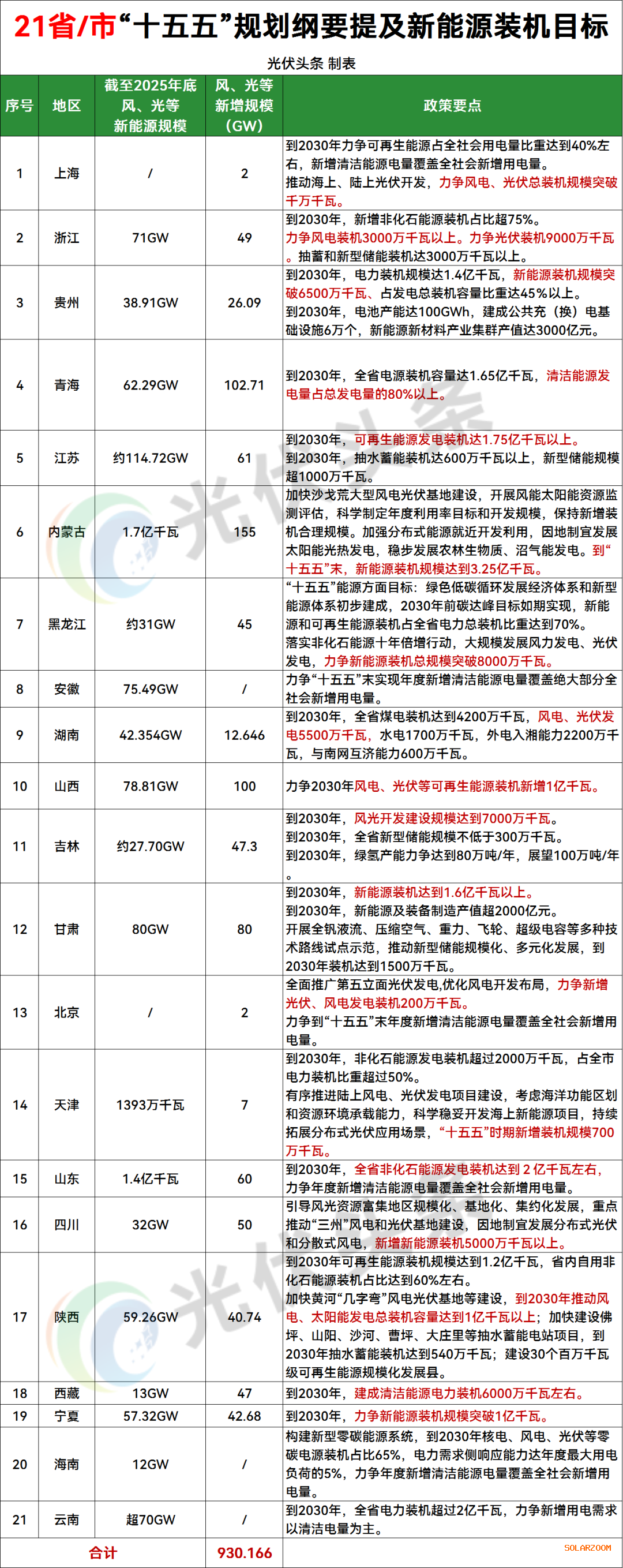 上海、浙江、贵州、青海、江苏、内蒙古、黑龙江、湖南、山西、吉林、甘肃、北京、天津、山东、四川、陕西、西藏、宁夏18省/市明确“十五五”新增风、光装机规模超930GW。
