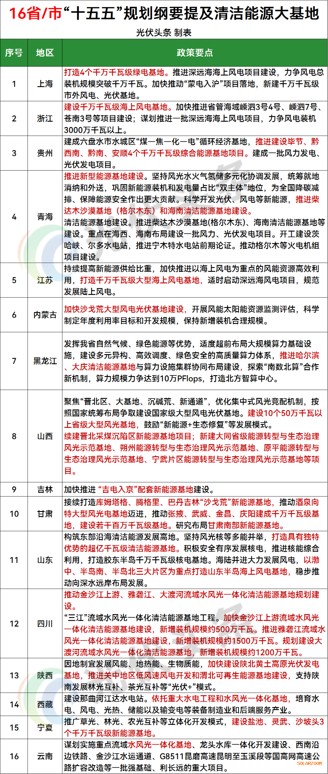 16省/市提及清洁能源大基地:上海、浙江、贵州、青海、江苏、内蒙古、黑龙江、山西、吉林、甘肃、山东、四川、陕西、西藏、宁夏、云南;