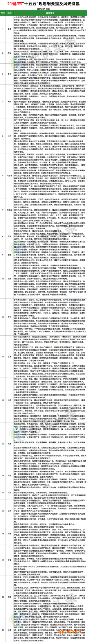 在21省/市“十五五”规划纲要中,上海、浙江、贵州、青海、江苏、内蒙古、黑龙江、安徽、湖南、山西、吉林、甘肃、北京、天津、山东、四川、陕西、西藏、宁夏、海南、云南21省/市提及新能源装机目标。
