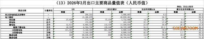 太阳能电池出口额也在增长。一季度累计出口36.1亿个,同比增长37.7%;金额600.85亿元,同比增幅30.5%。