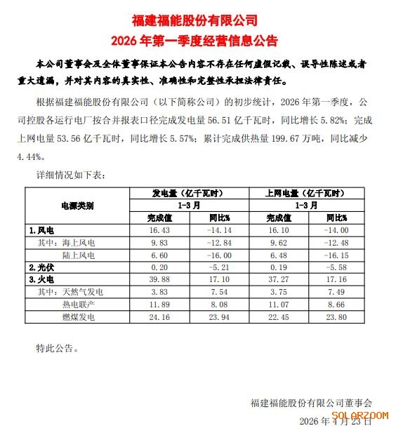 4月23日,福能股份发布2026年第一季度经营信息公告。