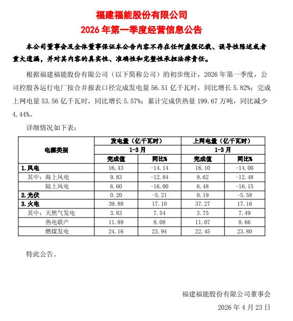 公告显示,2026年第一季度,福能股份控股各运行电厂按合并报表口径完成发电量 56.51 亿千瓦时,同比增长5.82%;完成上网电量 53.56 亿千瓦时,同比增长 5.57%。
