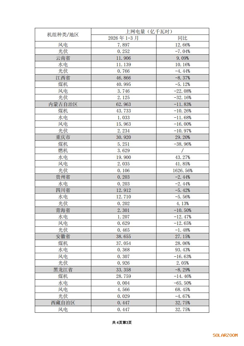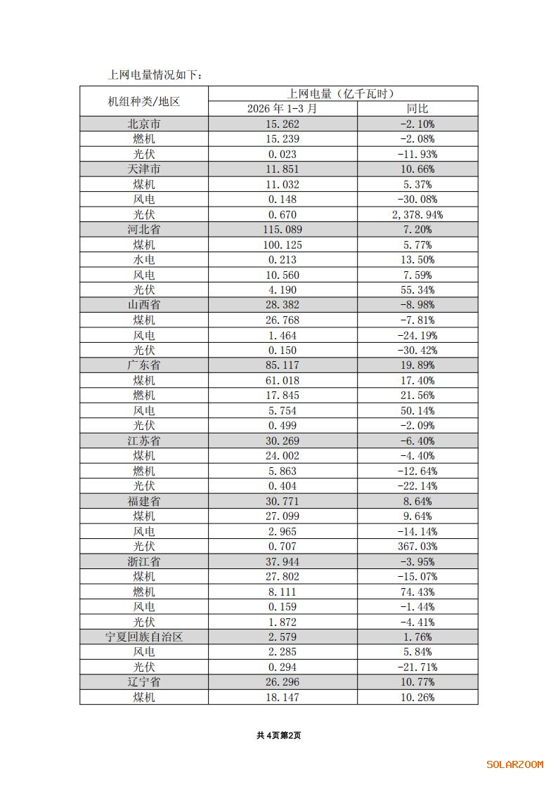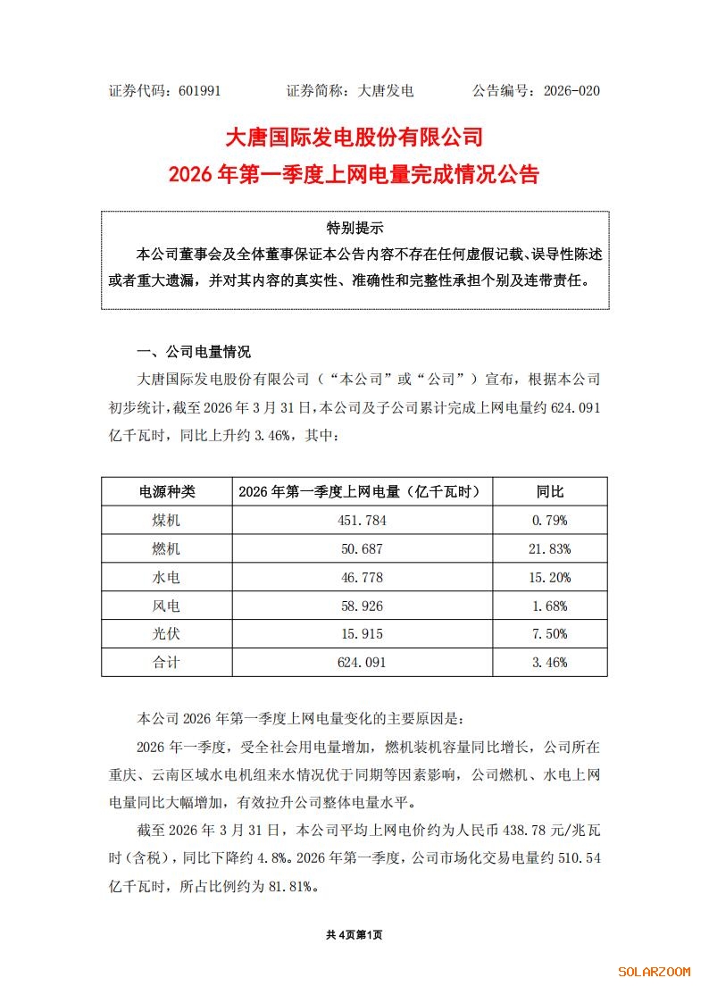 4月23日,大唐发电发布2026 年第一季度上网电量完成情况公告。