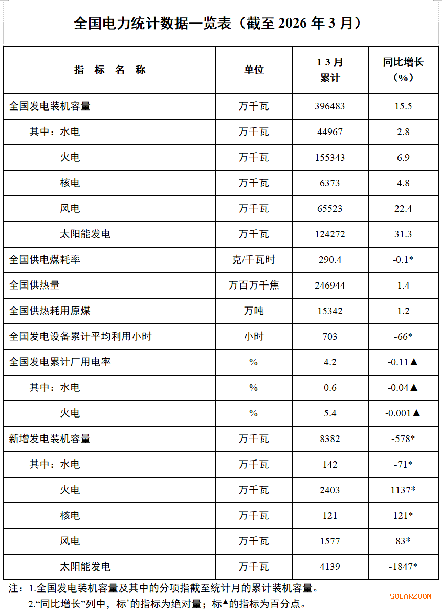 据国家能源局消息,4月23日,国家能源局发布1-3月份全国电力统计数据。截至3月底,全国累计发电装机容量39.6亿千瓦,同比增长15.5%。其中,太阳能发电装机容量12.4亿千瓦,同比增长31.3%;风电装机容量6.6亿千瓦,同比增长22.4%。