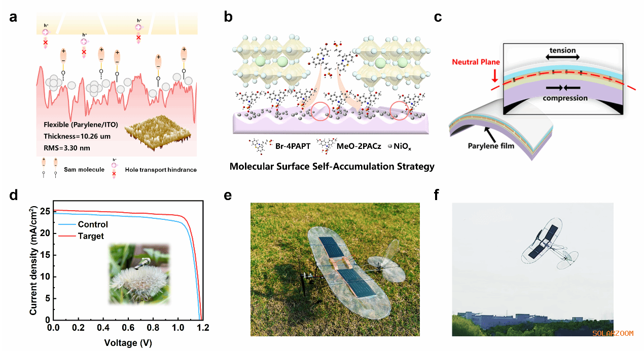 该研究提出一种分子表面自聚集策略,可缓解界面空穴传输的空间异质性问题,同时制备出结晶性能优异的钙钛矿薄膜。将Br-4PAPT分子掺入钙钛矿前驱体溶液,Br-4PAPT分子在钙钛矿结晶驱动下动态扩散并选择性聚集至钙钛矿薄膜的底部界面,与底部的MeO-2PACz协同作用,形成更完整的空穴传输通道。该策略使以聚对二甲苯(parylene)为柔性基底(9 μm)的超薄F-PSCs实现了24.47%的光电转换效率,在超薄柔性钙钛矿光伏领域达到国际先进水平。此外,研究团队还在聚萘二甲酸乙二醇酯(PEN)柔性基底上制备出5×5 cm2的柔性模组,该柔性模组在户外自然光照射下,成功为航模的短途飞行有效供电。结合力学中性面调控,柔性器件具备优异的机械稳定性,在2 mm弯曲半径下弯折循环10000次后,仍能保持初始光电转换效率的91.8%。