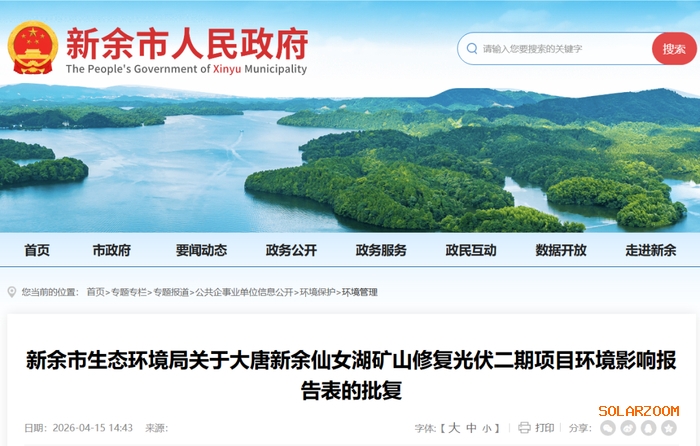 此前1月23日,江西省新余市生态环境局发布关于大唐新余仙女湖矿山修复光伏一期项目环境影响报告表的批复。