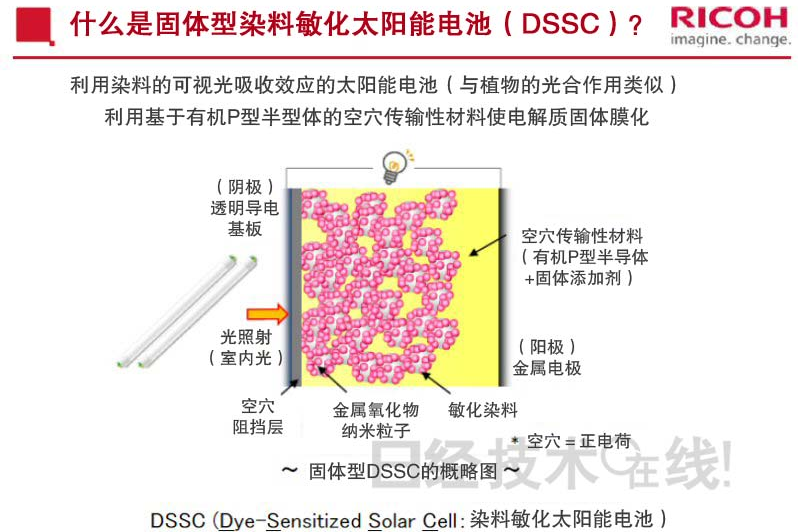 在该染料敏化太阳能电池的开发中,理光在针对室内光进行优化的同时,还挑战了全部由固体材料构成的完全固体化。为此,电解质使用了在有机P型半导体(spiro-OmetaD)中加入了固体添加剂的材料。一般情况下,液体tBP是添加剂的成分之一。而理光此次将tBP换成了固体碱性材料,因此实现了完全固体化。另外,将tBP换成固体碱性材料后,内部电阻也更适合室内光,有助于在室内光下提高输出功率。