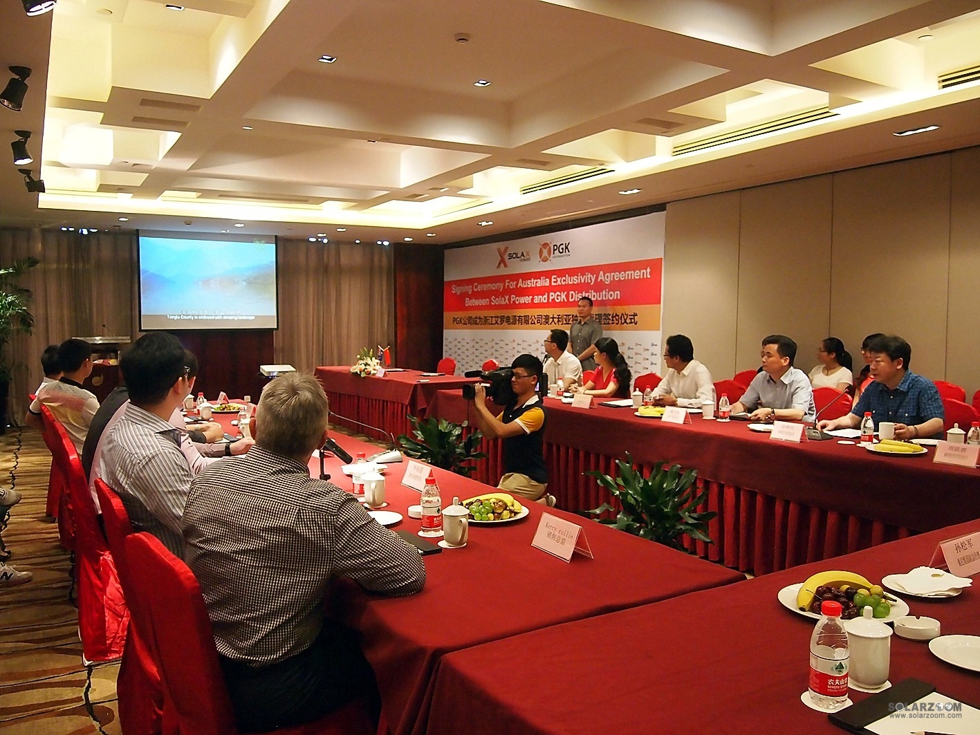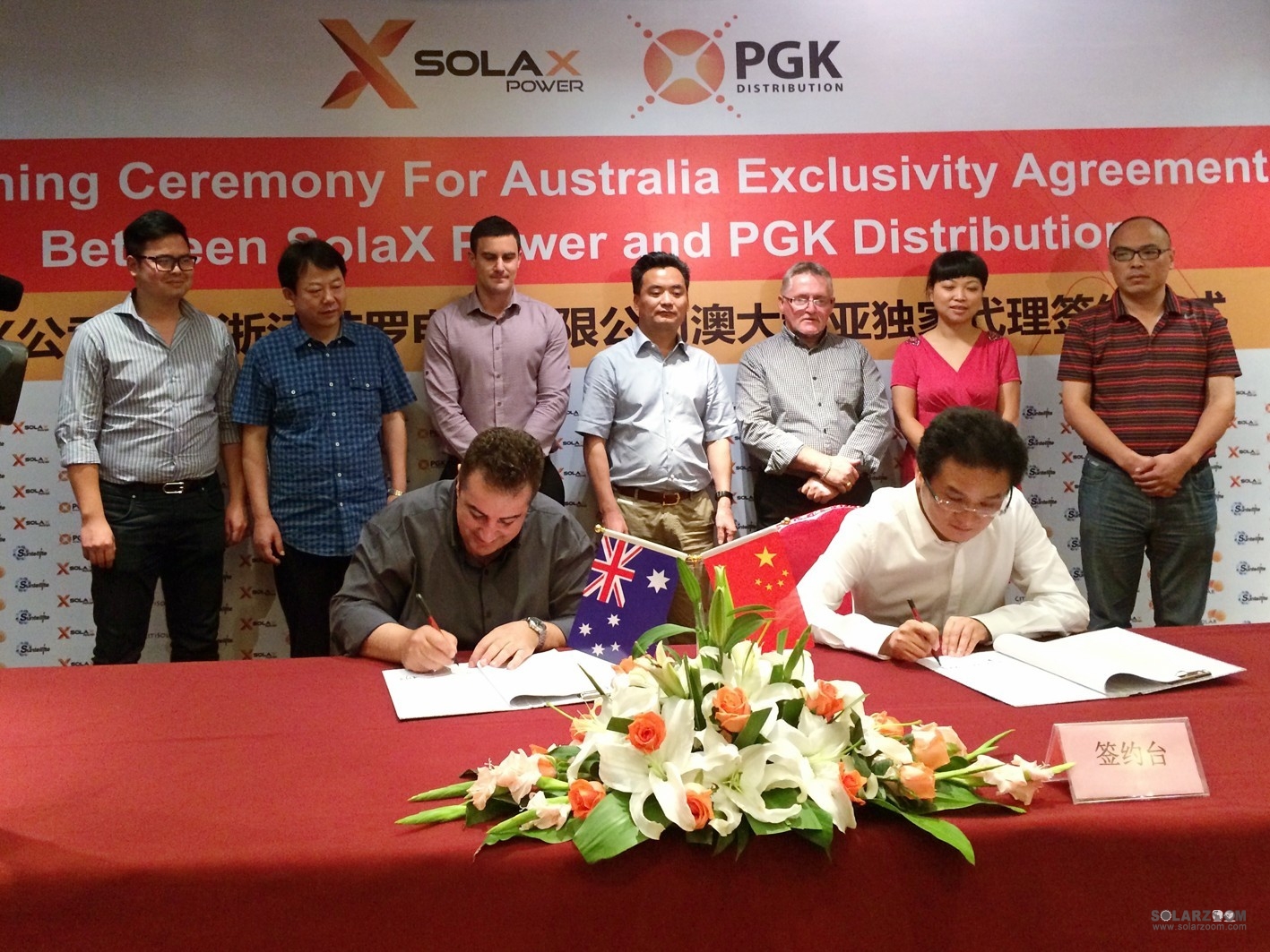 2014 年7月24日,在中国“最美县城”浙江桐庐,杭州桑尼能源科技有限公司旗下子公司浙江艾罗电源有限公司与PGK公司签订了澳大利亚地区光伏逆变器、光伏储能逆变器产品独家代理商协议,PGK公司董事长Paul Kyranides、桑尼能源董事长李新富,桐庐县人民政府潘立铭副县长等参加了签约仪式。