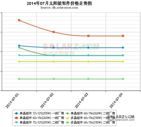本周组件价格低位维稳,单晶组件下滑趋势明显。单晶72*125(205W)组件一二线企业价格周末与周初相比下跌1.07%,单晶 60*156(260W)组件一线企业报价已经跌破5元/w,二线企业价格也下跌4.34%。而多晶60*156(250W)一二线企业价格周末与周初相 比价格均为明显变化。本周整个多晶组件市场相对较为平稳,基本止跌回稳,价格多集中在3.8-4.2元/w左右,个别企业有反馈从6月最后一周开始陆陆续 续询单有所增加,但大部分企业表示未有明显变化。单晶方面,下跌较为明显,目前日本等传统单晶出口国家进入需求淡季,因而单晶仍然在下跌中。对于下周,相 对也较为关键,很多企业都是“翘首以盼”。