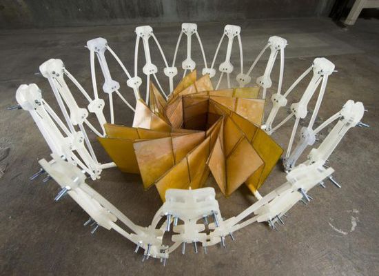 Brian Trease是美国宇航局喷气推进实验室的一名机械工程师和折纸爱好者。他曾与来自美国杨百翰大学的研究人员和折纸专家罗伯特•朗开发出的折叠起来8.9英尺大小,展开直径达到令人叹为观止的82英尺的数组。作为概念验证,该团队创建了一个桌面大小的原型,扩展范围刚刚超过4英尺宽,通过组合不同类型的折纸褶皱而产生。 这种方法的吸引力在于该阵列可以收拾成便携的小件发射便于在太空展开部署。