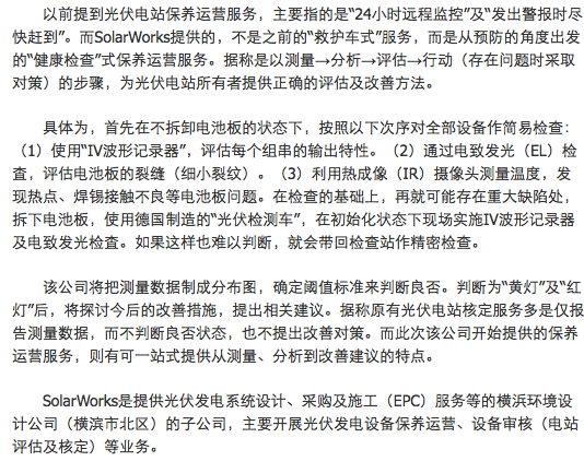 SolarWorks公司(日本横滨市都筑区)10月8日宣布,将开始提供评估光伏电站状态、及时发现问题并提出今后改善对策建议的保养运营(O&M)服务。目前光伏电站转卖市场在扩大,故此需要掌握合适的转卖价格。此次的核定评估服务设想也可应对这一需求。