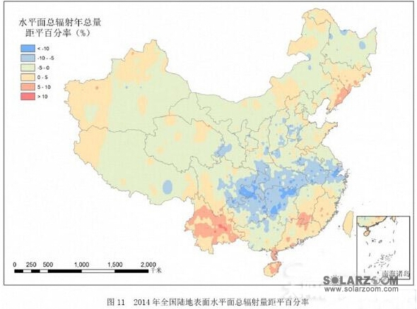 2014年,全国陆地表面平均的水平面总辐射年辐照量为1492.6kWh/m2,较近10年(2004-2013年)平均值偏少8.1kWh/m2(图9),为近10年来次小值年。