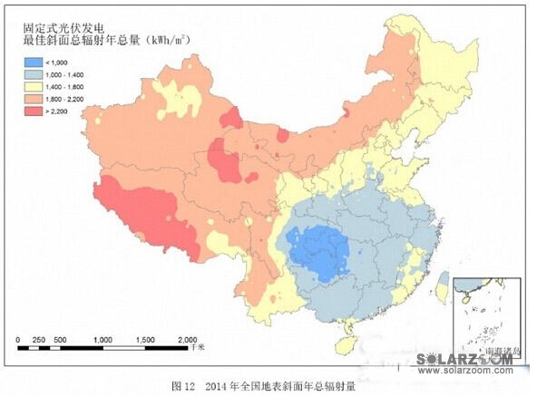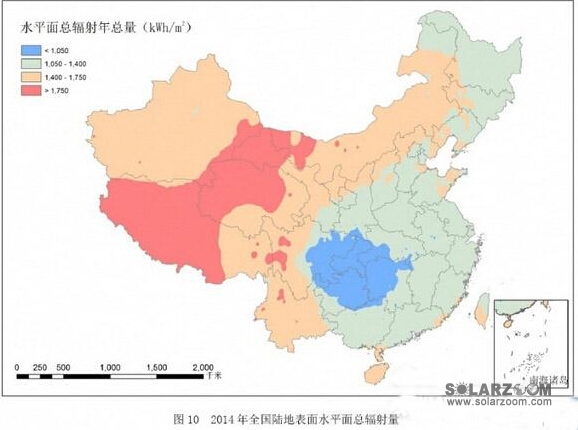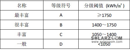 2014年,我国太阳能资源最丰富区包括青海大部、西藏中西部、甘肃西部、内蒙古西部,新疆东部及四川西部部分地区,年总辐射量超过1750kWh/m2,等级为A;华北北部、新疆大部、甘肃中东部大部、宁夏、陕西北部、青海南部和东部、西藏东部、四川西部、云南大部及海南等地为1400~1750kWh/m2,为太阳能资源很丰富区,等级为B;东北大部、华北南部、黄淮、江淮、江汉、江南及华南大部为1050~1400kWh/m2,为太阳能资源丰富区,等级为C,四川东部、重庆、贵州中东部、湖南中西部、湖北西部地区不足1050kWh/m2,为太阳能资源一般区,等级为D。