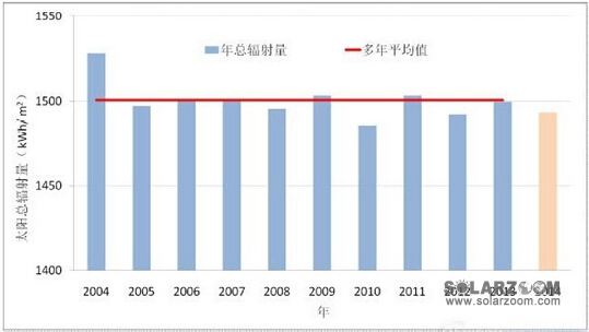 近日,中国气象局风能太阳能资源中心发布《2014年风能太阳能资源年景公报》。公报显示:2014年,全国地表平均水平面总辐射年辐照量约为1492.6kWh/m2,较近10年(2004-2013年)平均值偏少约8.1kWh/m2,为近10年来次小年。云量和霾日数增多是地表太阳总辐射量减少的主要原因。