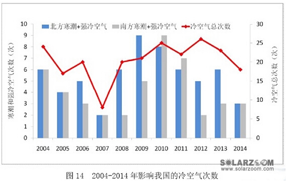 2014年,冷空气发生频次偏少、强度偏弱是全国平均风速偏小的主要原因。