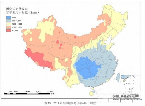 全国最佳斜面总辐射及光伏发电年利用小时数空间分布显示(图12、图13),2014年,我国东北、华北、西北及西南大部最佳斜面总辐射年总量超过1400kWh/m2,年利用小时数在1100小时以上,其中新疆大部、青藏高原、甘肃西部、内蒙古、四川西部及云南部分地区,最佳斜面总辐射年总量超过1800kWh/m2,年利用小时数在1500小时以上,局部超过1800小时;四川东部、重庆、贵州中东部、湖南中西部及湖北西部地区,最佳斜面总辐射年总量小于1000kWh/m2,年利用小时数不足800小时;其余地区最佳斜面总辐射年总量在1000~1400kWh/m2之间,年利用小时数在800~1100小时之间。