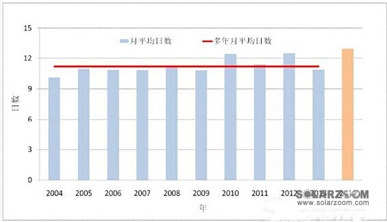 在新疆和西藏等地区偏大、在中国东北至长江中下游地区偏小的主要原因。2014年,全国大部分地区云量增多,总云量大于8成的月平均日数增多,是近10年来的最大值(图15),这是导致到达地表的太阳总辐射量减少重要原因之一。