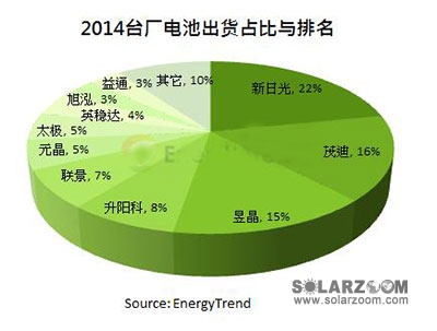 2014年台湾太阳能电池片虽垄罩在美国反倾销调查阴影下,但根据TrendForce旗下新能源事业处EnergyTrend最新的调查报告,随着产能增加及转换效率提升,全年出货再创新高峰,正式突破10GW大关,发货量年成长高达20%。