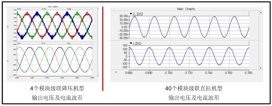 采用调制波反向的单极倍频移相载波调制方式,相邻两个三角载波移相角度θc采用半周期移相,即θc=π/N(N为级联单元个数)。由图2可以看出,级联模块多的直挂机型,输出电压及电流波形的正弦度,要明显好于级联模块数量少的降压机型。