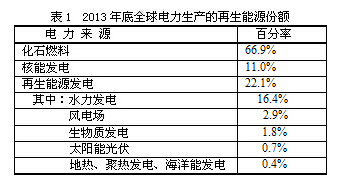虽然各国情况不同,其再生能源的商品价格也各不相同,但从这些表中可以看出,发电成本最低仍然是火力发电,特别是燃煤发电;在清洁能源中,水力发电是最低的,其次为核能发电。火力发电、水力发电和核能发电的商品价格都容易被市场接受,而再生能源发电从表1可以看出,2013年水力发电和风电场所占份额最高,两者占再生能源发电的87.3%,其电力价格均可被市场接受。
