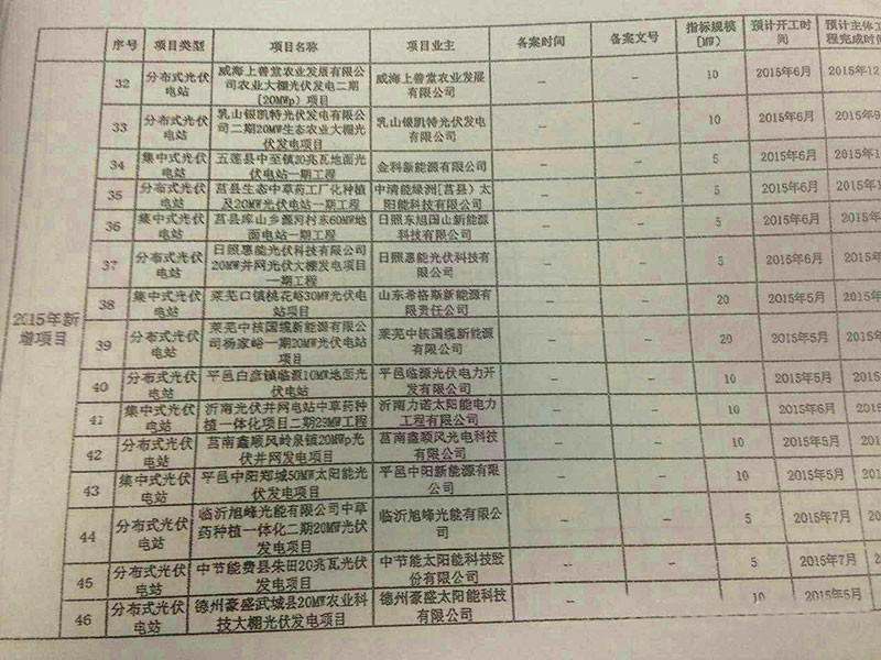 山东省2015年光伏发电实施方案报送表(62个项目名单)