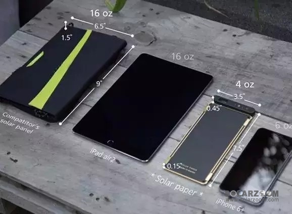 与同类型的太阳能充电器相比,Solar Paper 的整体尺寸与重量优势明显,厚度仅为 1/10、重量仅为 1/4,而与 iPhone 6 Plus 的 77.8×158.1×7.1 mm 相比,Solar Paper 的整体尺寸与 iPhone 6 Plus 没有太大的差别,厚度则相当,你甚至可以把它夹在笔记本里。