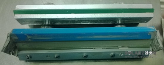 2.探求匹配的网版浆料与刮条:栅线印刷的理想效果是取得较大的高宽比,即栅线既高又细,这需要网版与浆料有效配合。之前存在一种现象是为降低印刷重量,一味降低网版线宽,而搭配的浆料较黏,频繁出现断栅和虚印现象,而部分虚印电池片在正面垂直检验时又很难发现,极易漏检。实验前使用的网版为400目18膜厚37线径,现优化为360目16um膜厚37线径网版,过墨性提高,浆料固定为杜邦18H,配以合适的丝印参数及产线的有效监控,明显地改善了丝印外观质量。同时由于之前使用的条形刮条易磨损,且要6小时更换一次,现引进一种新型刮条,由于接触面大,耐磨损,不仅降低了断栅、虚印产生几率,并且其寿命为一般刮条的10倍左右,如图3,上方为常规条形刮条,下方为改用的板式刮条。
