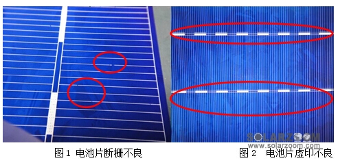 丝网印刷段产生的断栅、虚印等不良现象是太阳能电池片外观和EL检查的主要缺陷项,通过优化丝网印刷网版、匹配合适的浆料以及改善丝网印刷作业方法可以有效减少印刷不良现象的产生,同时通过电参数的监控、电池片外观、EL的特殊检查也能有效地预防。