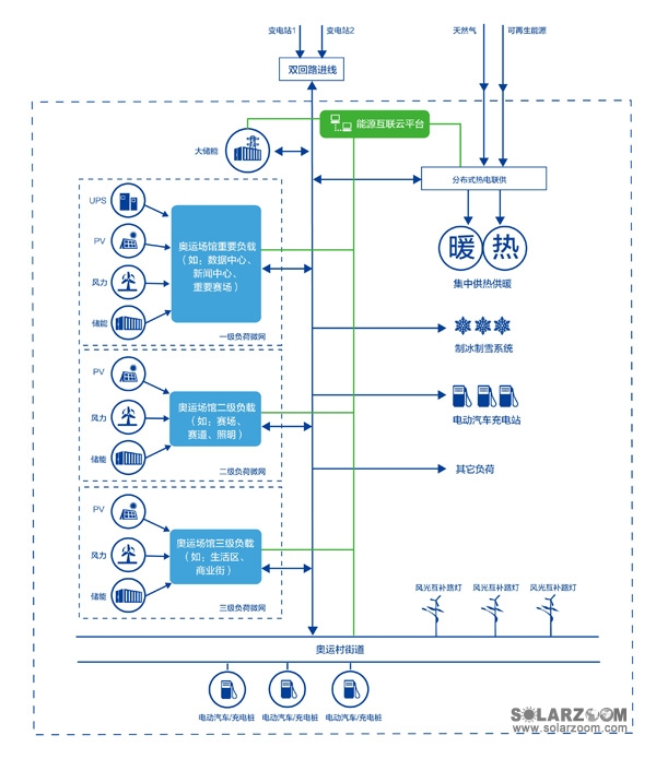 陈皓:我们设想未来的奥运村将是大电网结合微电网的供电网络,奥运村的微电网就是以天然气、风电、光伏以及储能等手段,设置多个微电网群来配套奥运村的多样基础应用实现电力保障。针对奥运村的供暖则采用天然气集中供暖与可再生能源供暖方案,应急备用,逐级保障,从而真正实现分布式的热电联供。
