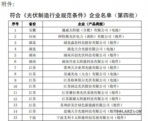 日前,工信部公布符合《光伏制造行业规范条件》企业名单(第四批)。此次入围的企业共有36家,其中,电池片企业4家,组件制造商17家,逆变器企业5家,硅片厂家10家。详见图。