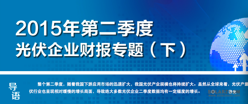 2015年第二季度,光伏企业在光伏回暖的影响下,大部分企业的数据均有不同程度的涨幅。但是从市场来看,光伏的向上趋势比较平缓。从各家已经公布的第二季度财务数据看,90%的企业实现盈利,尤其相比去年同期,涨幅非常显著。同时从数据上,我们也可以看到,光伏产业链从上游到下游发展迅速,高新组件的需求增加也是行业经济增长的重要因素。