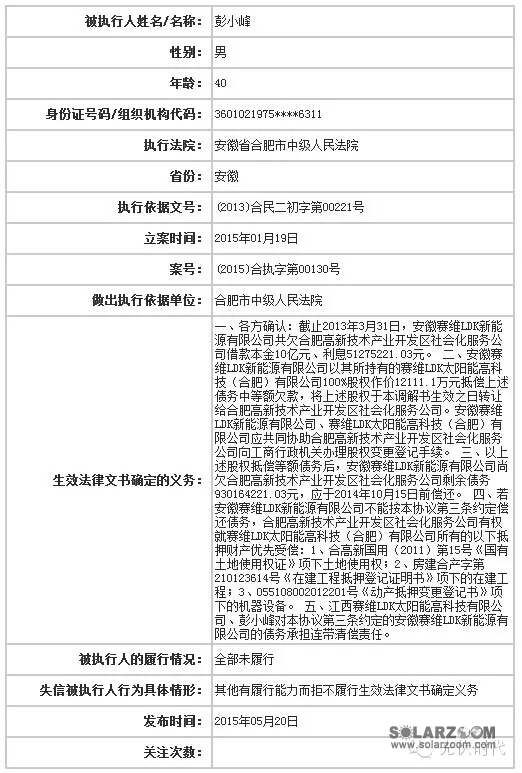 现任SPI绿能宝董事长彭小峰由于赛维LDK关联债务问题被列入全国法院失信被执行人名单。