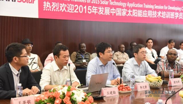 座谈会上,乐叶光伏海外销售经理王建勋介绍了公司的基本情况以及未来的海外发展计划,多次强调了公司的单晶技术路线,表达了单晶必将引领光伏未来的信心。甘肃自然能源研究所副所长李世民顺势也提到位于兰州的最早的光伏电站,采用单晶组件,运行时间超过30年,至今仍然正常运转,体现了极好的可靠性。随后外籍学员也踊跃向乐叶咨询技术和将来的合作方式等问题,气氛热烈。