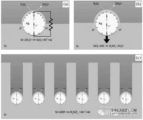 另外一种可大规模产业化的黑硅技术是湿法黑硅技术。早在2006年,德国的Stutzmann小组即提出了金属催化化学腐蚀的概念并在实验室进行了初步的研究;直到2009年,美国国家可再生能源实验室(NREL)的Branz博士提出了全液相黑硅制备方法,将湿法黑硅技术朝产业化方向又推进了一步。但是,他们一直未能解决好黑硅表面钝化难题,使得湿法黑硅技术一直停留在实验室阶段。湿法黑硅技术基本原理如图2所示,采用Au、Ag等贵金属粒子随机附着在硅片表面,反应中金属粒子作为阴极、硅作为阳极,同时在硅表面构成微电化学反应通道,在金属粒子下方快速刻蚀硅基底形成纳米结构。