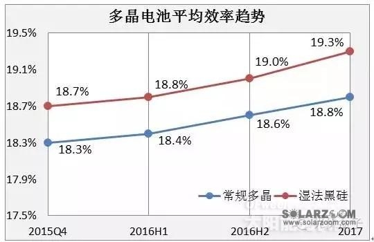 多晶电池效率的提升受制于表面反射率的降低。常规多晶主要采用酸制绒,形成蠕虫状的坑洞;而单晶采用碱制绒,形成金字塔结构的绒面。相比单晶电池,常规多晶电池的表面反射率高3%~5%(绝对值)。降低表面反射率是提高多晶电池效率的关键。成本方面,单晶硅片受益于金刚线切割工艺的推广,成本大幅下降;而多晶硅片金刚线线切的推广受制于电池制绒工艺的匹配,具体讲,金刚线线切多晶硅片使用常规制绒工艺后,反射率更高并有明显的线痕等外观缺陷,严重降低电池效率。阿特斯开发的湿法黑硅技术完美的解决以上问题,既能提升电池效率又能降低电池成本,是多晶电池继续进步的必由之路。