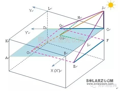 坡面上的影长和在水平面上的影长存在一定的几何关系,在坡屋面上建立如图3几何模型,先以北坡面进行分析。假想水平面为BCLK,JC为建筑遮挡物的高度,以C点为原点,以边长BC和CL建立坐标系,其中X方向表示东西方向,Y方向表示南北方向,水平面向下旋转一定的角度(坡角)得到坡面ABCD,坐标系的横轴不变,纵轴变为Y’轴。光线通过J交于水平面BCLK于O1点,并交于北坡屋面ABCD于O点,如上所述高度为H的遮挡物在水平面上影长在图2中已经说明,在本图3它的X和Y分量长度分别是|CI|和|CH|,延长JH交于坡面于G点,连接OG,可以证明G点为O点在南北方向上的正投影,GC长度就是坡面上影长的Y’分量大小。再过G点作平行于水平面的直线交于JC的延长线于F点,过F作同一平面内的水平线并与JI的延长线交于E点,则EF长度就是坡面上影长的X’分量大小。