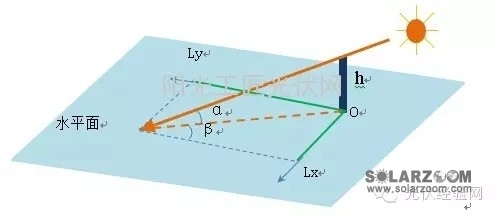 公式中为所在地的纬度,为赤纬角,为太阳时角。通过三角关系即可求出某一高度遮挡物在水平面上的阴影长度L,参见图1。以南北向为Y轴,东西向为X轴,建立坐标系可得到L的X分量和Y分量,那么Lx分量和Ly分量的大小可表示为: