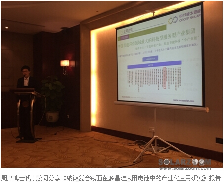 2015年11月26日至28日,第十一届中国太阳级硅及光伏发电研讨会(CSPV)在浙江杭州隆重召开,中节能太阳能科技(镇江)有限公司(以下简称:中节能太阳能镇江公司)的研究成果《纳微复合绒面在多晶硅太阳电池中的产业化应用研究》在11月27日下午的黑硅与金刚线专场会议中作了专题技术报告,引起了与会人员的广泛关注与热烈讨论。