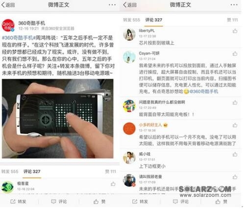 网友的评论五花八门,有说可以芯片投影的,有说不用充电、不用放SIM卡的,更有甚者竟然猜想手机“可以飞”,而这里面最靠谱的则是背面自带太阳能充电板。网友“小多的好主人”表示,以后的手机可以一个月不充电,没电了可以用太阳能,这样就不用每天背着移动电源满街跑了。
