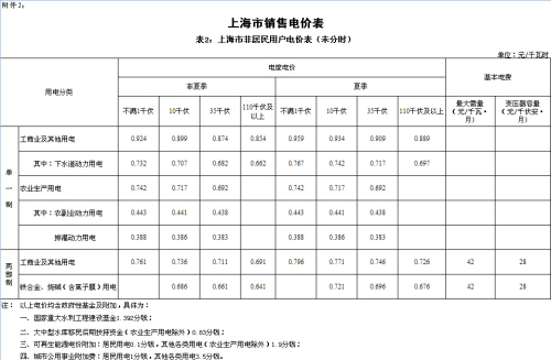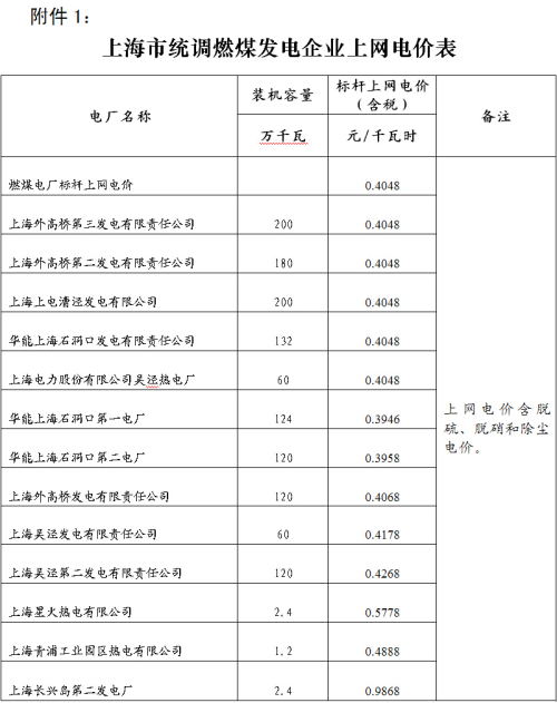 1月7日,上海物价局发布《关于实施煤电价格联动调整的通知》,本市燃煤发电上网电价每千瓦时下调3.11分钱(含税),调整后本市燃煤发电标杆上网电价为每千瓦时0.4048元,本市“工商业及其他用电”价格平均每千瓦时下调2.12分钱,可再生能源电价附加提高到每千瓦时1.9分钱。