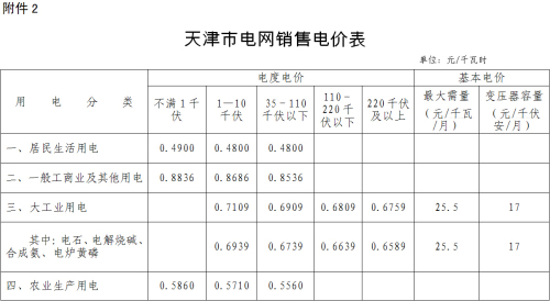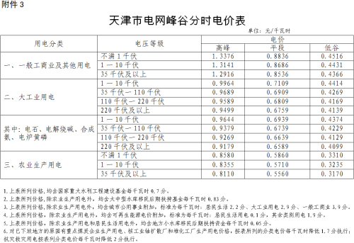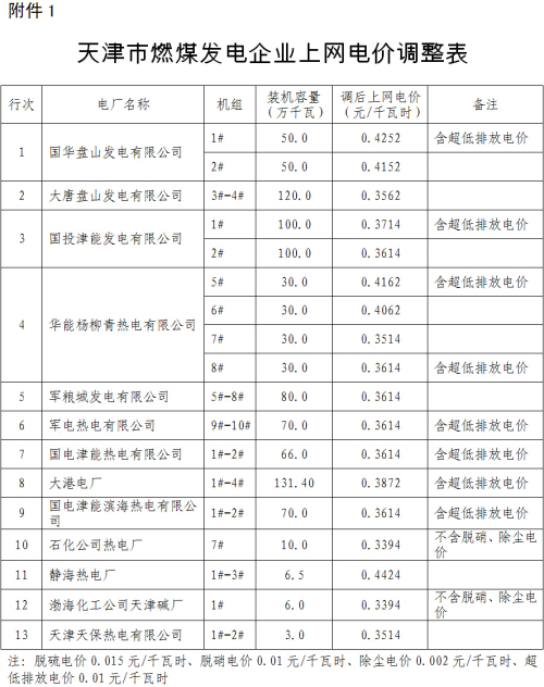 1月6日,天津市发改委发布了《关于降低燃煤发电上网电价和一般工商业用电价格的通知》,《通知》称天津市燃煤发电上网电价平均每千瓦时下调3.01分钱,同步调整后的我市燃煤发电标杆上网电价(含脱硫、脱硝和除尘)为每千瓦时0.3514元;一般工商业销售电价平均每千瓦时下调3.13分钱;可再生能源电价附加标准提高到每千瓦时1.9分。