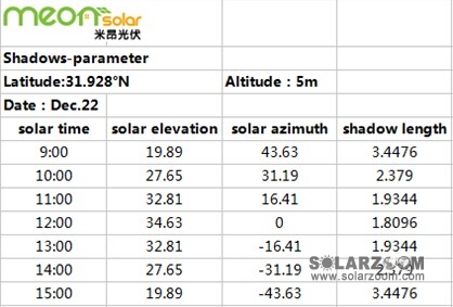 举例来说,米昂应用太阳阴影分析仪,结合日地运行规律,利用软件对冬至日(12月21-23日)待安装屋面的阴影遮挡情况进行模拟,并输出图表(见图1、表1)
