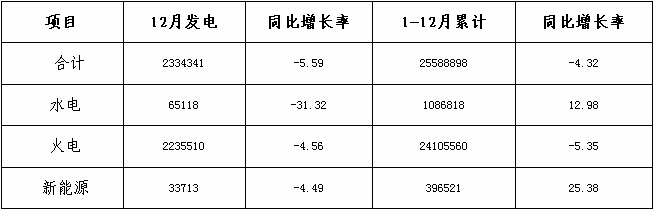 (一)发电量情况。1-12月,全省发电量2558.89亿千瓦时,同比减少4.32%。其中水电108.68亿千瓦时,同比增长12.98%;火电2410.56亿千瓦时,同比减少5.35%;新能源39.65亿千瓦时,同比增长25.38%。