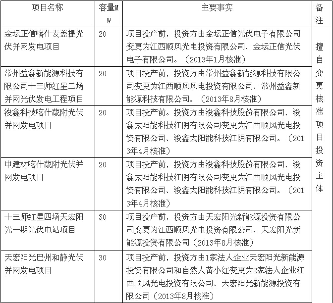 2.部分投资主体完成项目备案后,擅自变更项目投资主体,涉嫌违反《光伏电站项目管理暂行办法》(国能新能[2013]329号)第三十三条等规定。如广西鼎旭同辉绿色光伏电站项目等6个项目,占核查总数的0.29%。