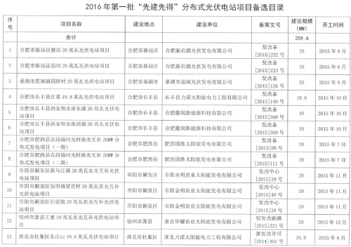 合肥等有关市发展改革委报来的合肥市新站区磨店20兆瓦光伏电站等13个项目相关手续办理齐全、主体工程建设较快,具备并网条件。按照《安徽省能源局关于进一步加强光伏电站项目开发管理的通知》(皖能源新能〔2015〕26号)精神,现将这13个项目列入我省2016年第一批“先建先得”分布式光伏电站项目备选目录,请项目单位据此向省电力公司和省物价局申请办理并网手续和电价批复。
