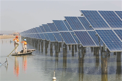 近日,连云港市首个“渔光互补”水上光伏电站正式并网发电,预计每年上网电量可达1000多万千瓦时,节约标煤3500吨,相应减少二氧化碳排放9200吨。该水上光伏发电项目占地面积15万平方米,4万多块太阳能光伏板架设在300亩鱼塘上方,设计总装机容量8兆瓦,总投资约1.2亿元。