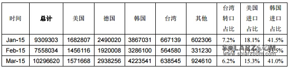 二、2月份从韩国进口多晶硅量为4700吨,虽环比减少,但在当月总进量中的占比仍高达45.3%。韩国的主要出口企业OCI和韩国硅业(HankookSilicon)的税率仅为2.4%和2.8%,反倾销税对其根本不造成任何影响,故韩国在2014年5月超过美国和德国,一跃成为最大的进口来源地,之后连续保持首位。2月份自韩国按加工贸易方式进口多晶硅512吨,占自韩国进口总量的10.9%,较之前50%左右的加工贸易占比有所降低。同时,从韩国进口多晶硅价格自2015年4月份开始连续十一个月进口创历史新低,2月份月均价低至12.92美元/千克,同比大幅下滑31.8%。以上数据看出,“58号文件”严格执行后,韩国通过加工贸易方式规避反倾销税有所收敛,但由于“双反”对韩国反倾销惩罚幅度过于微弱,韩国无论是以一般贸易方式或者加工贸易方式出口到中国,对其都毫无影响,故可以一再压低价格倾销。可见,韩国无论从是在进口价格或者进口量方面都严重冲击着国内多晶硅市场,因此对韩国倾销进行复审应视为重中之重。